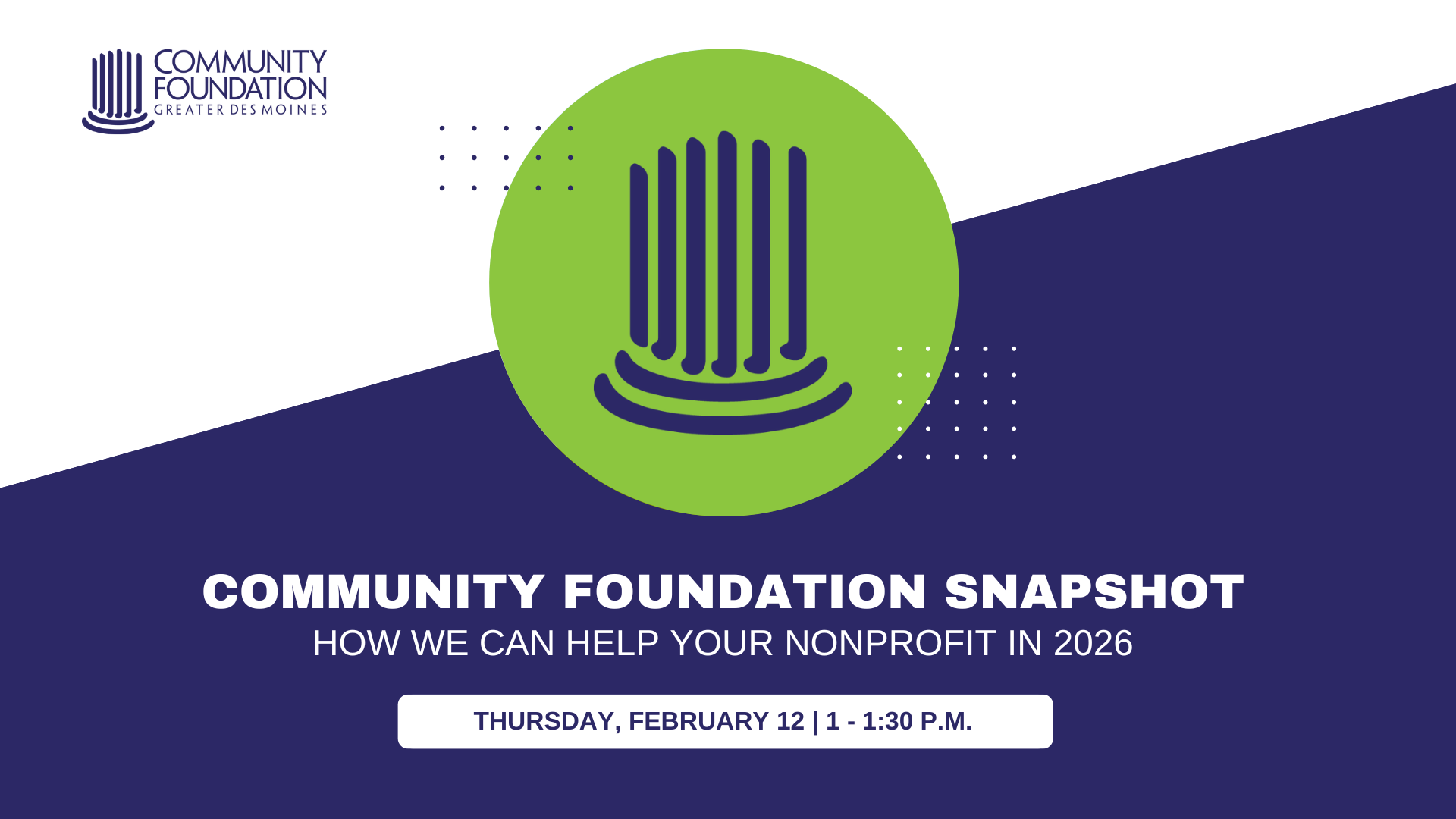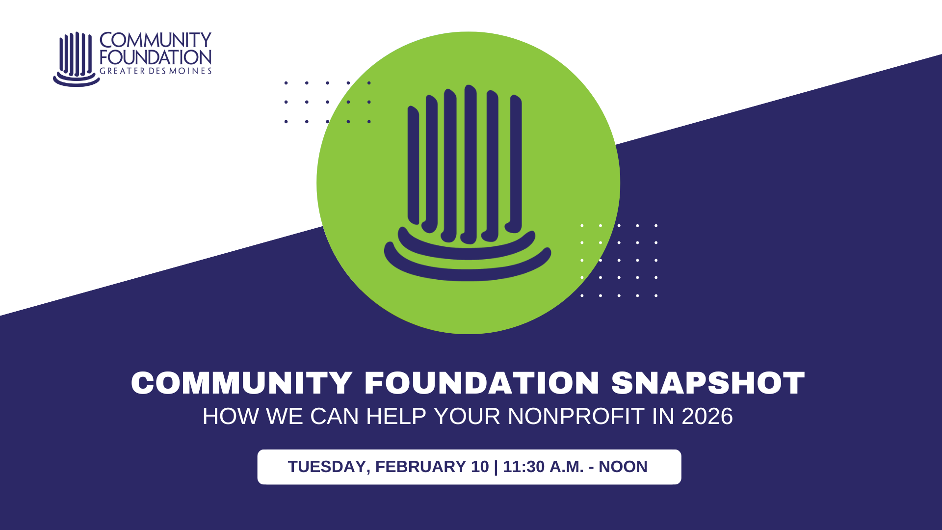 Join us to learn about opportunities for your organization to partner with the Community Foundation in 2026! In this session, Ellie Burns will review our various grant programs, including criteria, process and deadlines to apply for funding. She will also give you a preview of our upcoming nonprofit trainings, share information about our employment and consultant databases, introduce you to our Colleague Connect peer networking opportunities and share information about available resources, including GIVEdsm.